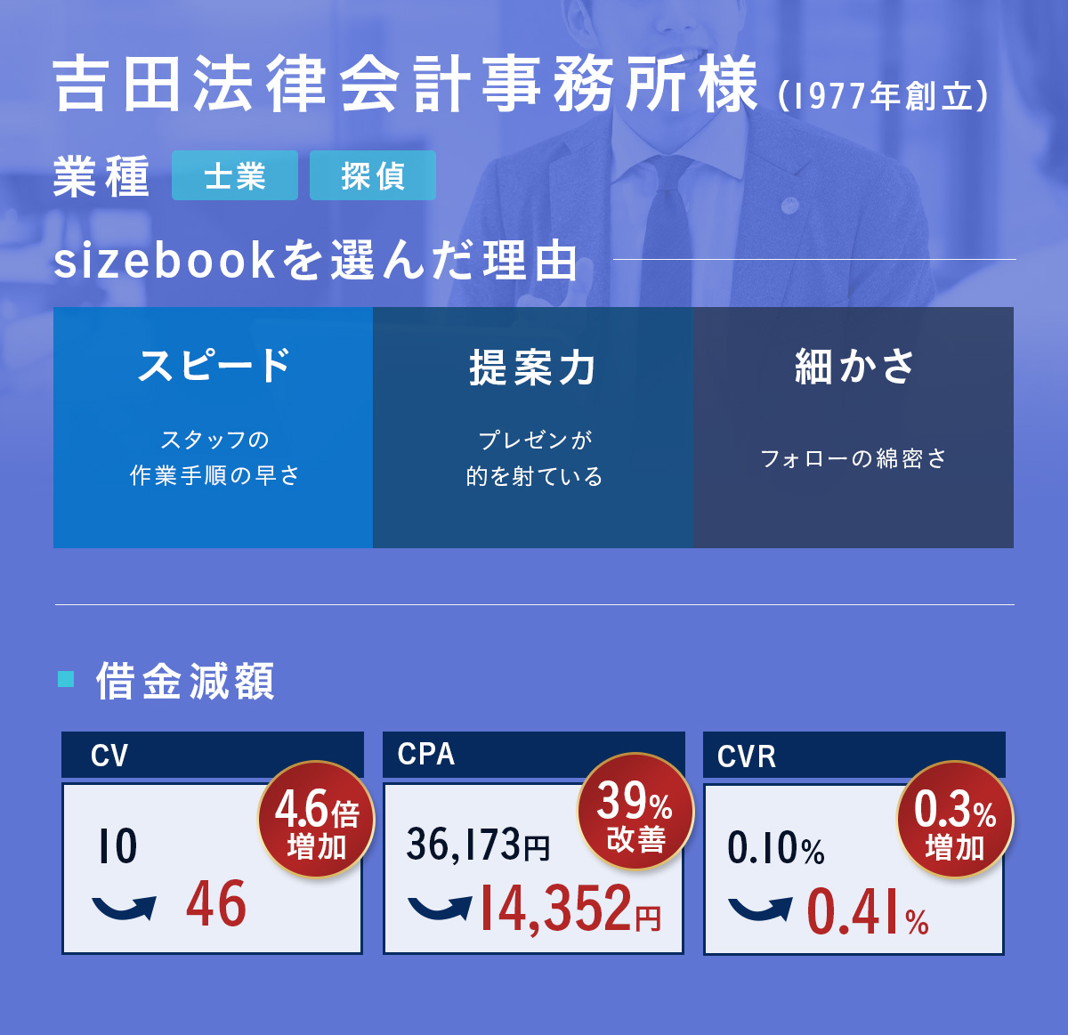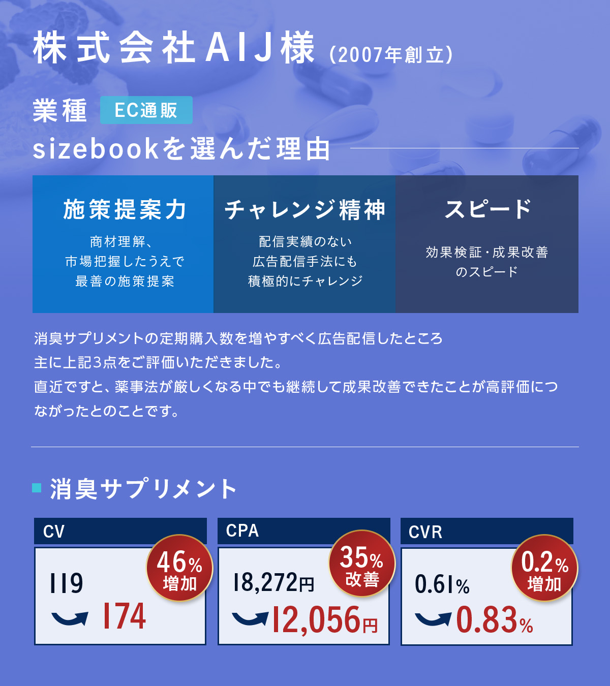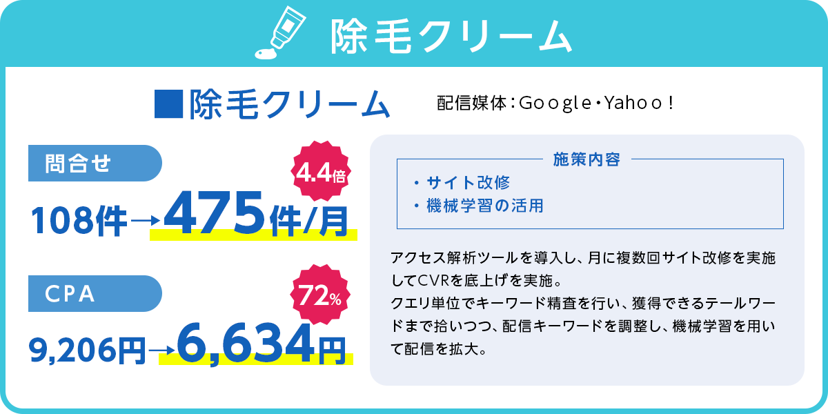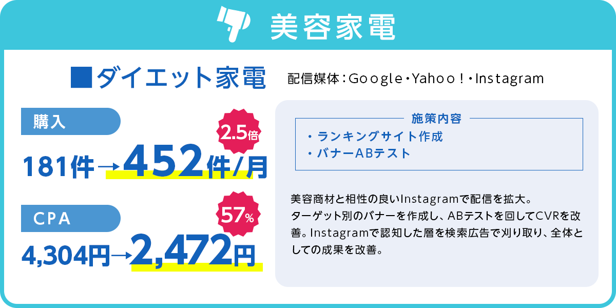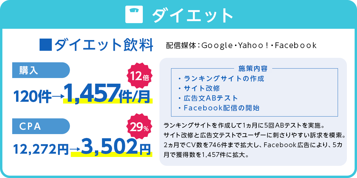 法律を遵守するだけでなく、法律の制限の中で、獲得できる方法について研究を重ねており、特に規制よる影響の強い化粧品、健康食品等々でも高い実績を上げております。